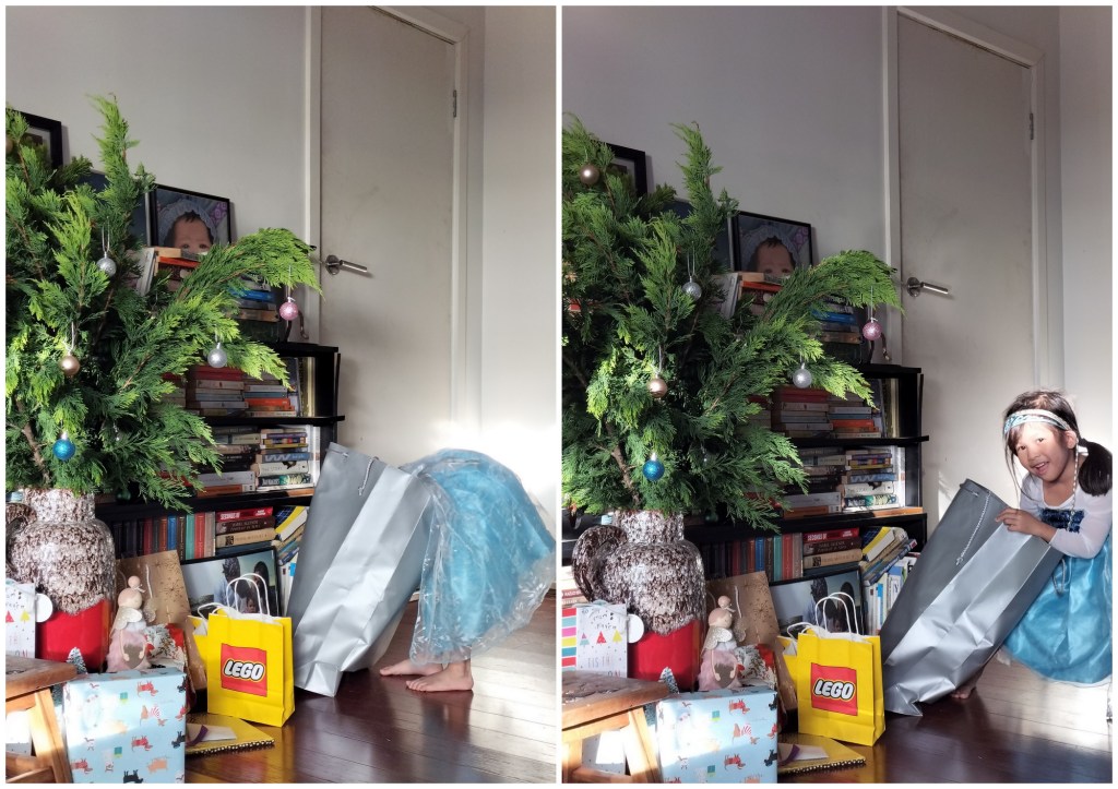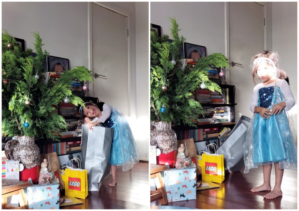 Dressed in her Elsa costume, Raven loved the tree still. I don’t think it even mattered to her what it looked like. The only thing that mattered to her were the presents, of which she couldn’t help but notice why we had no present for her under the tree yet.