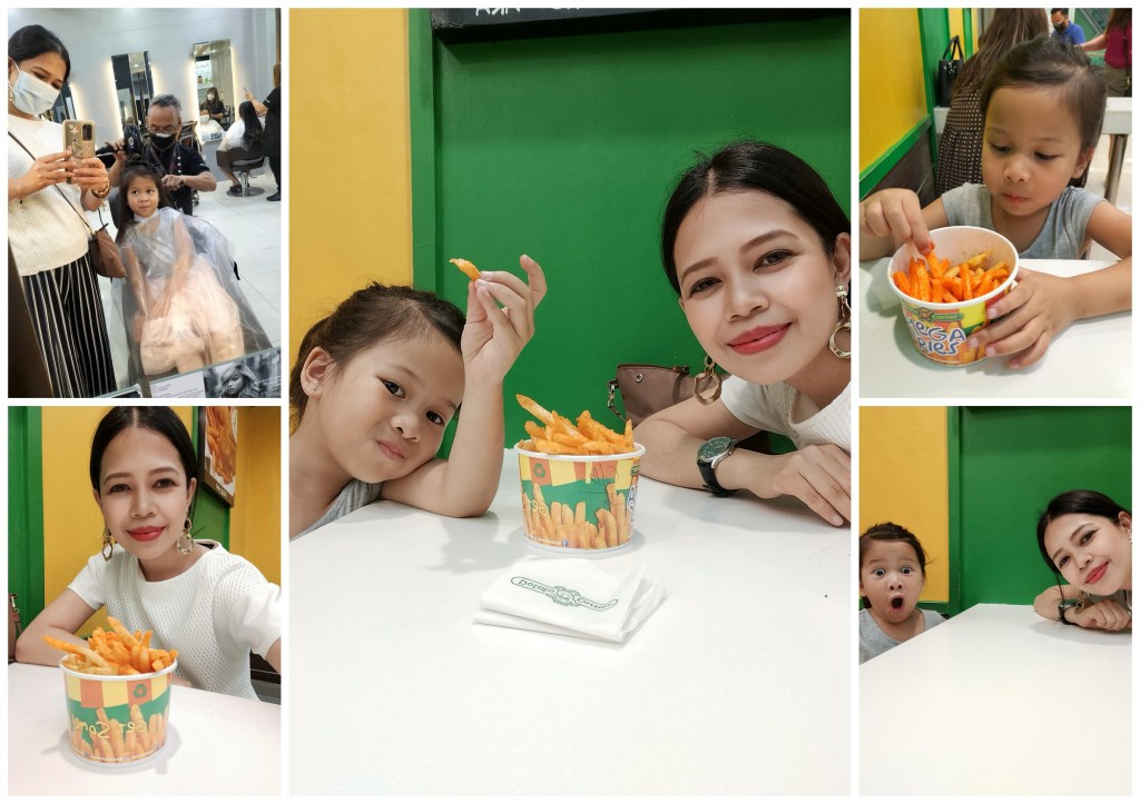 And by ‘culture,’ I also mean making her love Potato Corner with their cheese and barbecue combo. This was us patiently waiting for our fries after she had her haircut done by a stylist who obviously wasn’t happy with his job, judging from his total lack of customer rapport. I gave him a tip still anyway.
