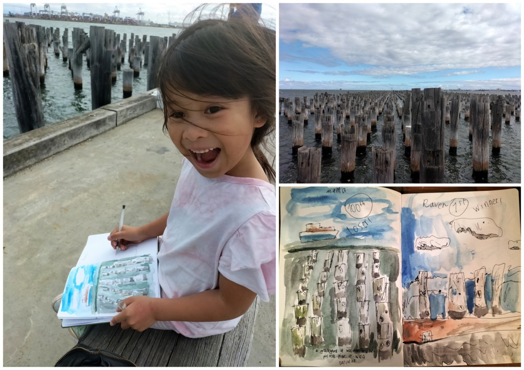 Raven came up behind me after scootering around and decided to give it a crack, as well. She wanted to turn it into a contest. See which one of us comes up with the best sketch. Only to end up being the judge and declaring me the loser.
