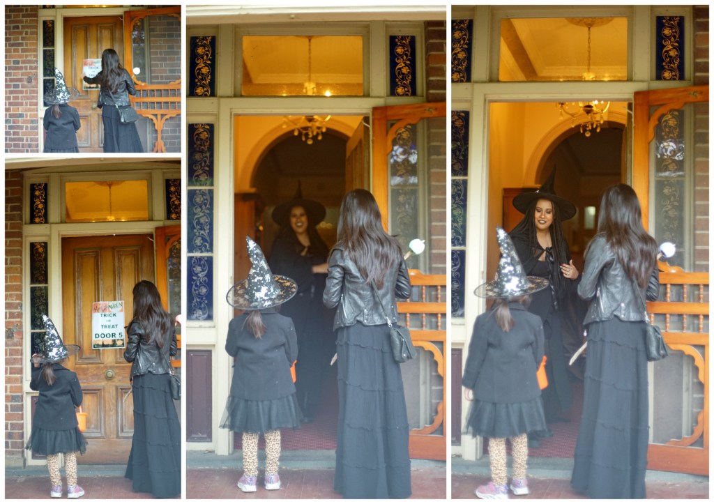 Like knocking on the assigned doors for trick or treat and witches opening them to hand out sherbets and cheap lollies. The first door, she was scared to knock, so I did.