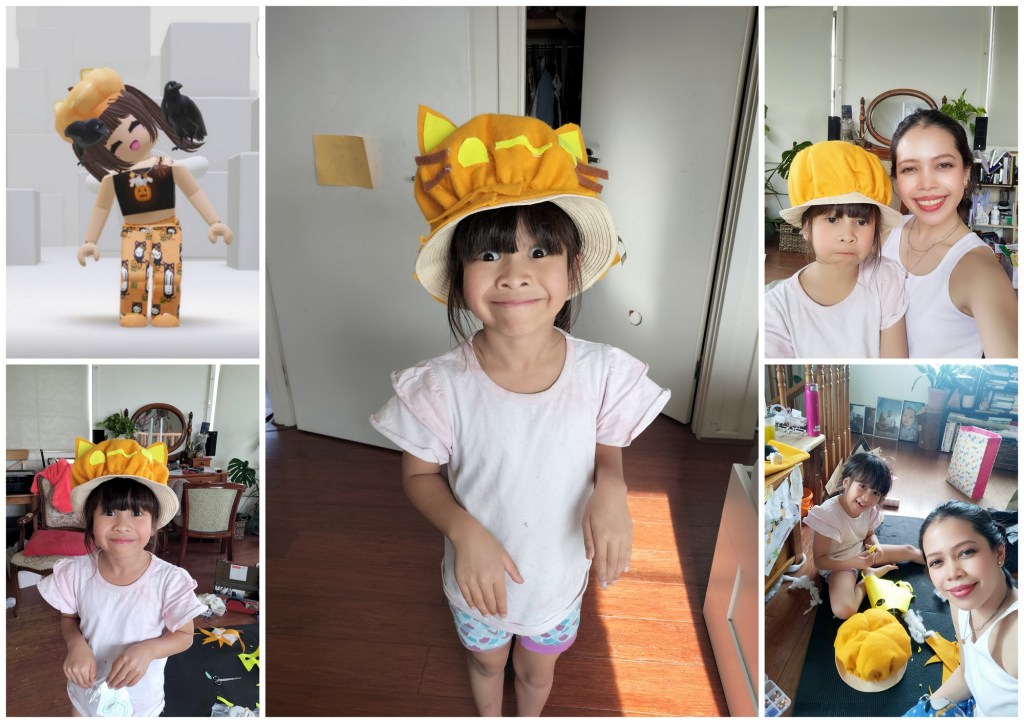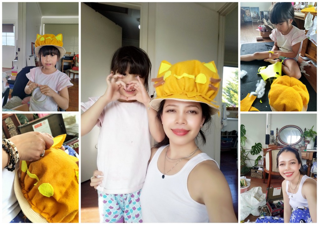 One day to watch DIY Youtube videos on how to make felt pumpkin decors and rack my brain on how to make it work given that I have to convert it into a hat; the next day to get overwhelmed at Spotlight to buy the materials needed; and later, an afternoon cutting the orange felt into a circle using a bronze Mayan calendar because it’s the biggest circular pattern I could find.