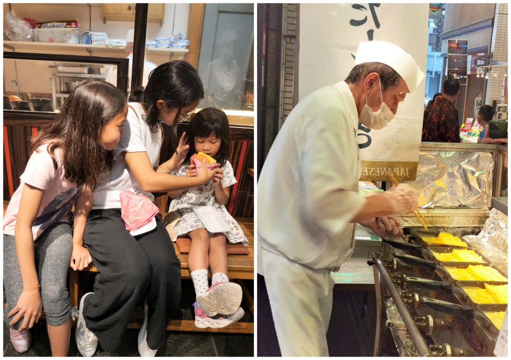 I gotta say he was a good marketing strategy to lure customers in. Nearby, a tray of Japanese omelet egg sandwich sat. The kids tried them while the rest of us got settled at our table.