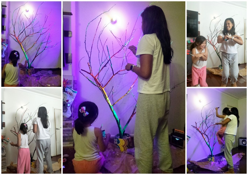 Once again, our backyard supplied us with another branch to DIY into a Christmas tree. This year was a collaboration between Raven and her aunt. A kaleidoscope of acrylic neon colours that, illuminated by Jeff’s UV light, shone like a bright forensic evidence that it was officially Christmas.