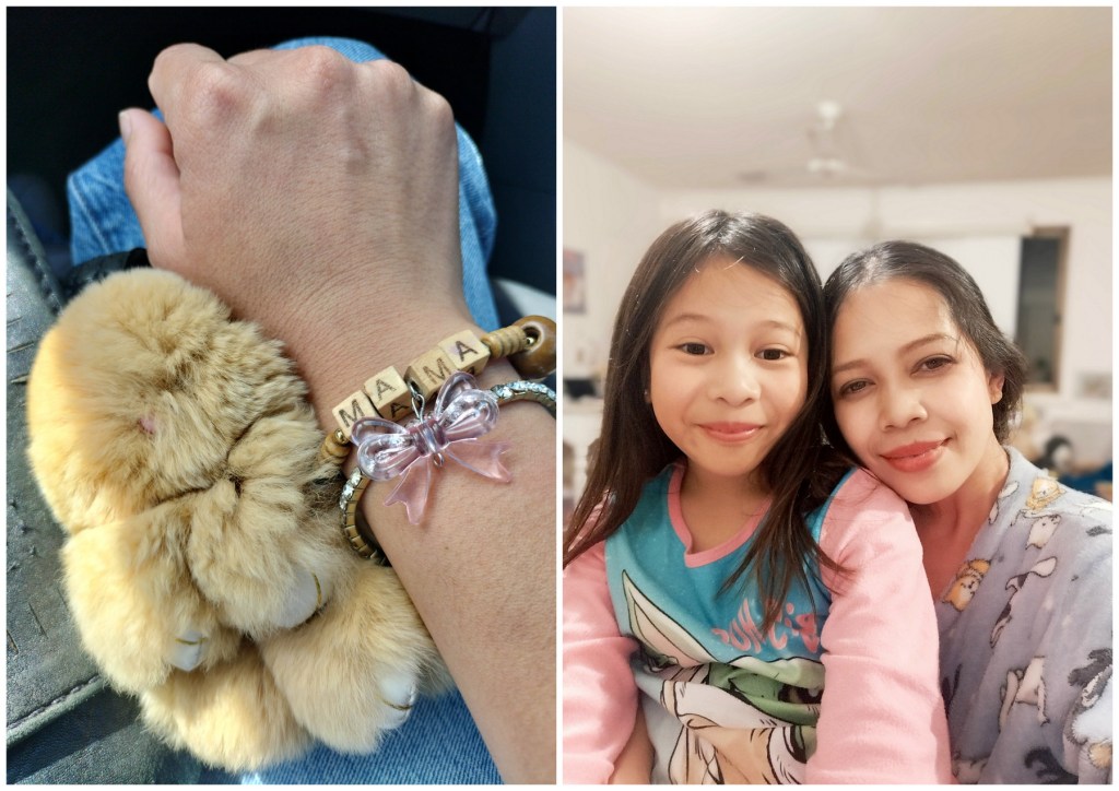 Wore my latest favourite accessory: a bracelet Raven made for me when she was in kinder. She remade it and strung the beads into an elastic cord (originally she used a pipe cleaner) and embellished it with a pink plastic bow.